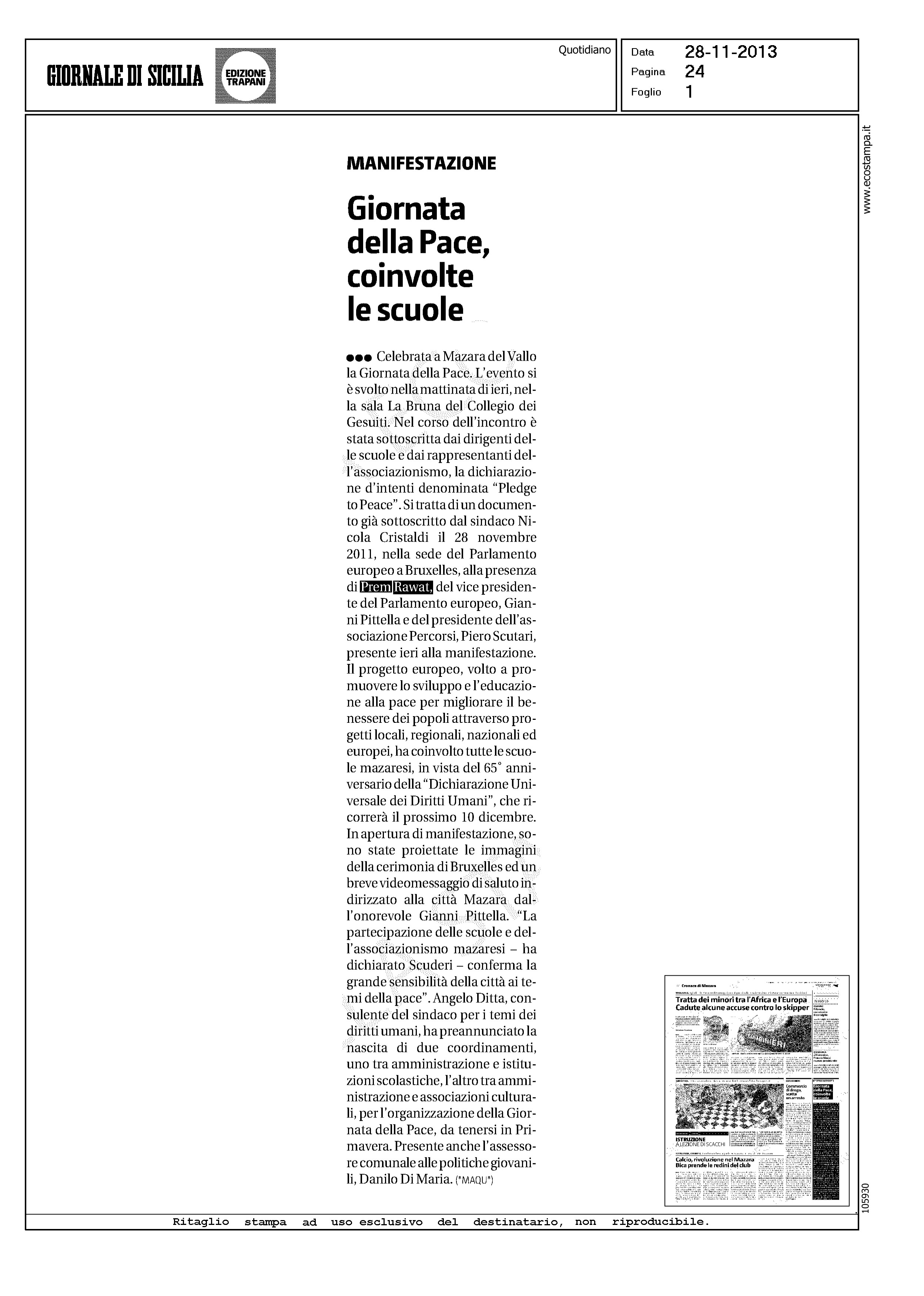 28 novembre 2013 Leggi l’articolo […] Download QRPrint QR Condividi questo articoloCategories: In classe per la pace, Pledge to Peace, Rassegna StampaTags: Giornata della pace, Mazara del Vallo