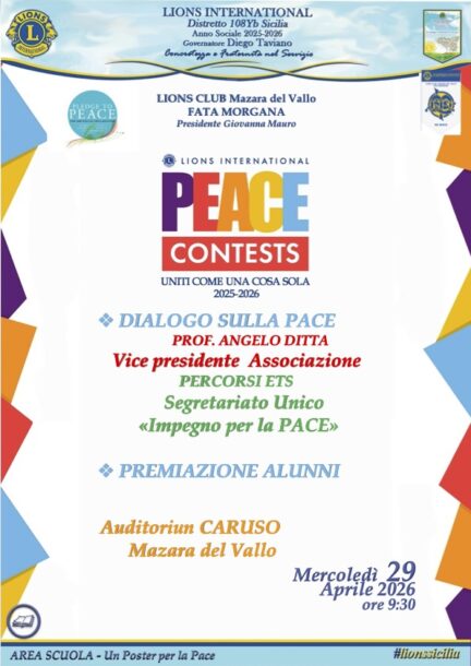 Il Club Lions promuove il concorso internazionale “Un Poster per la Pace”, a cui partecipano gli studenti delle scuole medie, invitati a esprimere, attraverso diverse tecniche artistiche, il proprio concetto di pace su un tema proposto annualmente.