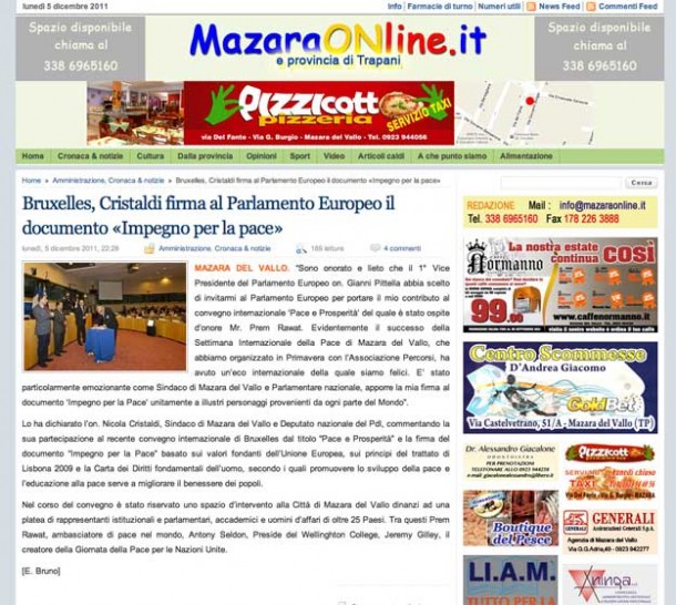 MAZARA DEL VALLO. “Sono onorato e lieto che il 1° Vice Presidente del Parlamento Europeo on. Gianni Pittella abbia scelto di invitarmi al Parlamento Europeo per portare il mio contributo al convegno internazionale ‘Pace e Prosperità’ del quale è stato ospite d’onore Mr. Prem Rawat. […]